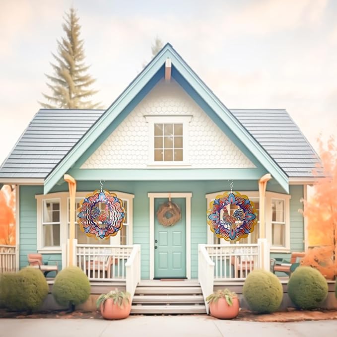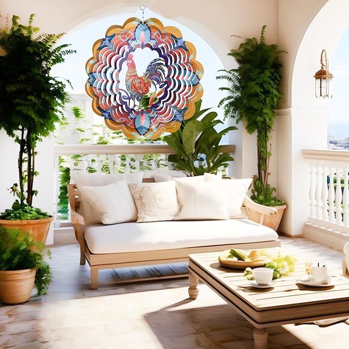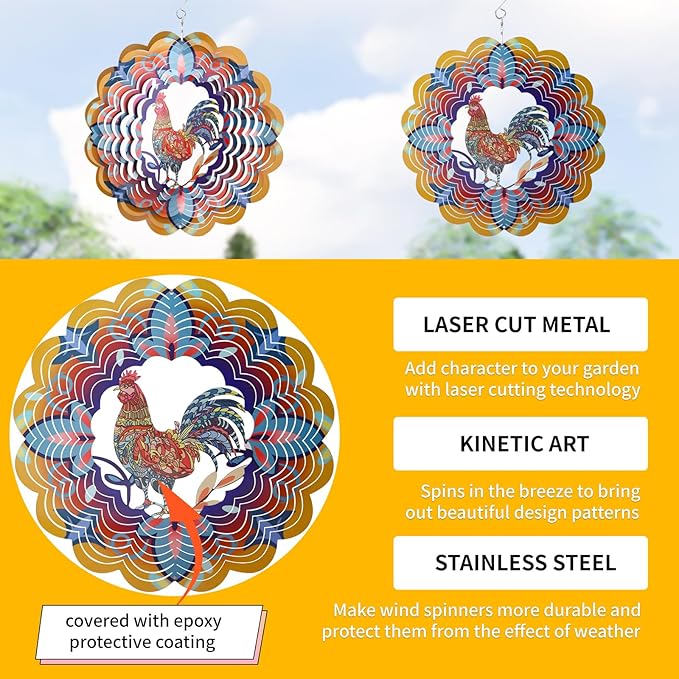 - 360 Degree Rotation 3D Wind Spinner Decor: This decorative hanging wind spinner is inspired by the enchanting rooster style. It showcases PUV printing technology and a frosted lacquer surface that shimmers as it spins. The distinctive design seamlessly blends meaningful animal motifs with 3D streaming effects, resulting in a visually captivating appearance. Ideal for enhancing the look of your garden and patio. Please ensure to use in windy conditions