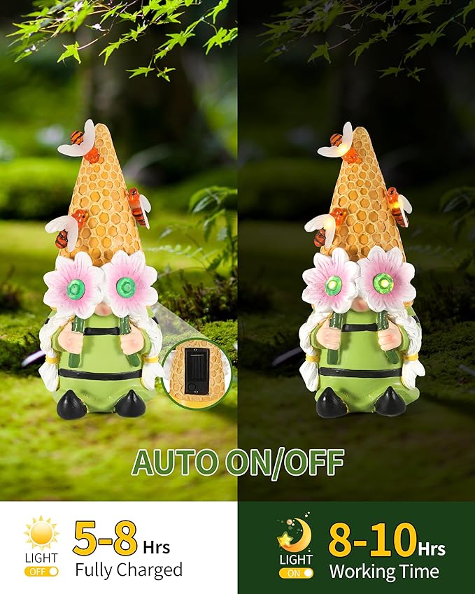 - ๐ก LED Lighting: As dusk falls, watch the gnomeโs flower eyes and bee come alive! The integrated LED lamp emits a soft glow, highlighting its intricate features.