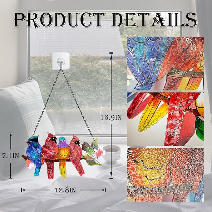 - Timeless Beauty and Elegance:Our stained glass window hanging colors are so vibrant & it's well made,There are different textures to the birds.Whether you're a bird lover or simply appreciate the beauty of stained glass. It adds a nice pop of color to the outdoor winter gloom you see through the windows.