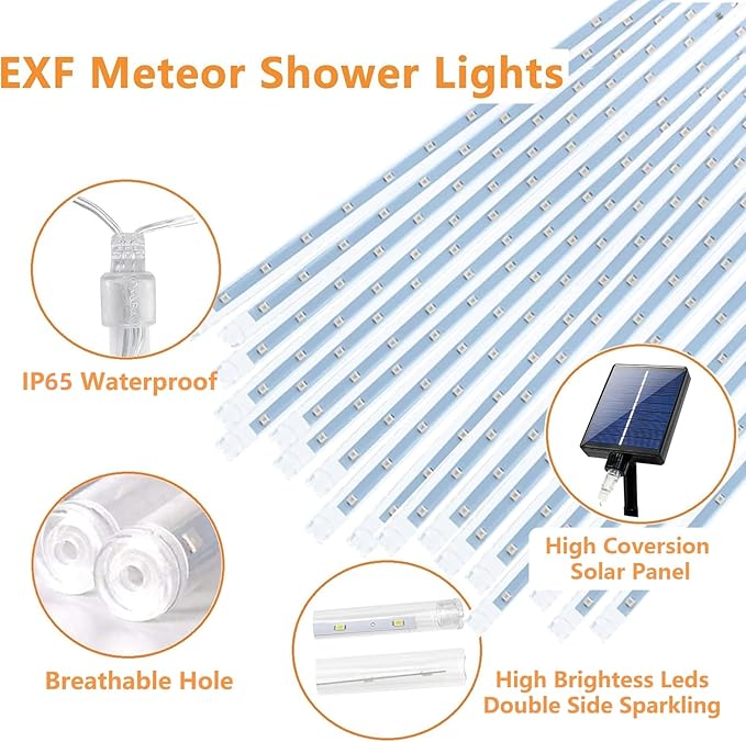 - Auto ON/OFF & Long-Lasting: The solar panel absorbs sunlight throughout the day, automatically turning lights on at dusk and off it at dawn. With a full charge of 6-8 hours under direct sunlight, the solar meteor lights provide up to 8-10 hours of illumination at night