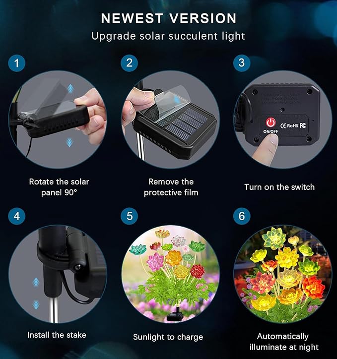- Upgraded Succulent Flowers Solar Lights-Compared with ordinary ground lights, each solar garden light has 12 succulent plant lights and green lifelike leaves. Their designs are more elaborate and realistic than other succulent decorations. We also upgraded the solar panels to a larger size and a higher conversion rate than other solar panels
