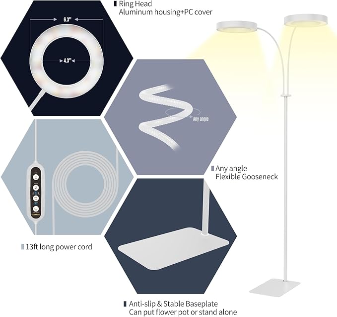 - 【Thoughtful Details】 The stable base will prevent the grow light from tipping over. The soft anti-slip pad underneath the base will protect the floor from damage. The power cord is upgraded to 13 ft long, suitable for more application scenarios .
