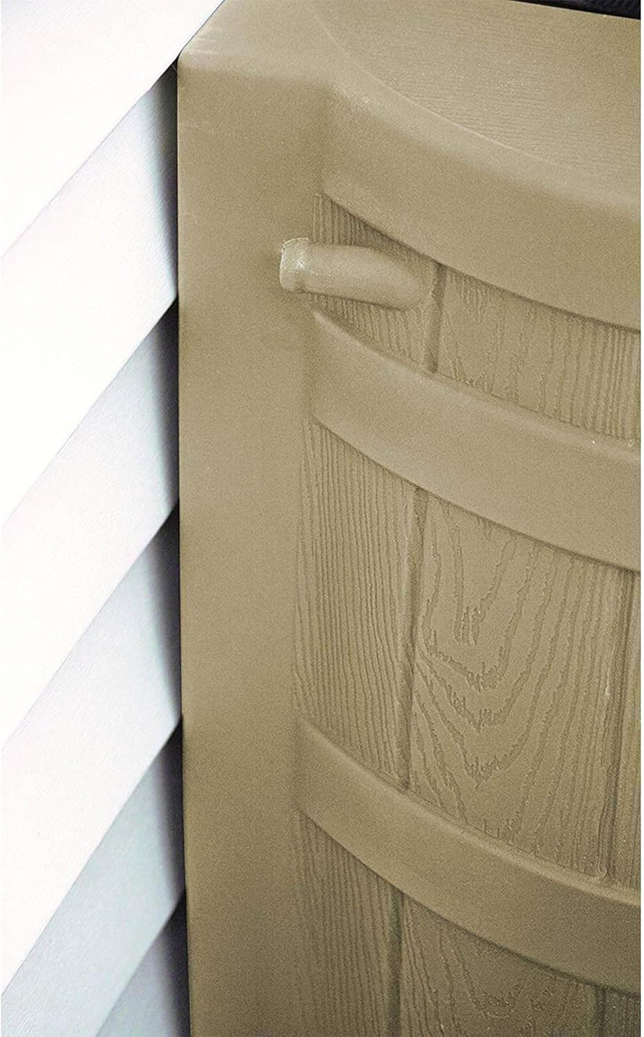 - Right Fit: Includes brass spigot so you can easily connect your hose or for use as an overflow spout; Fits right under your gutter system and features a screen to keep out debris and insects; Capacity: 50 gallons