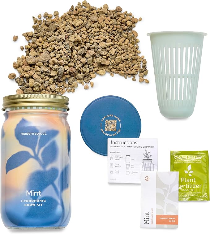 - Package Contents: 1 unit of hydroponic mint grow kit featuring a mason jar with a removable sleeve made from recyclable materials (6" high by 3.5" wide, weighing 1 lb), organic non-GMO mint seeds, a 100% recycled HDPE net pot made in the USA, lava rock grow medium sourced domestically, plant food, coaster, and detailed instructions; Designed for reuse and proudly assembled in the USA, it offers a sustainable way to grow fresh herbs indoors
