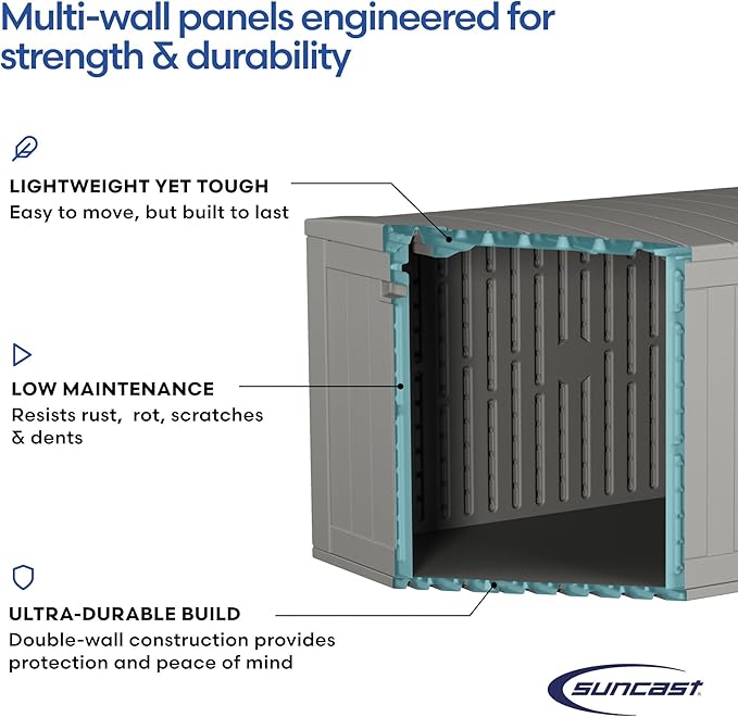 Suncast 120-Gal. All-Weather Patio Deck Box with Pad-Lockable Split Top Lid, Extra-Large Outdoor Storage Unit for Patio Furniture and Grill Tools, Made in the USA