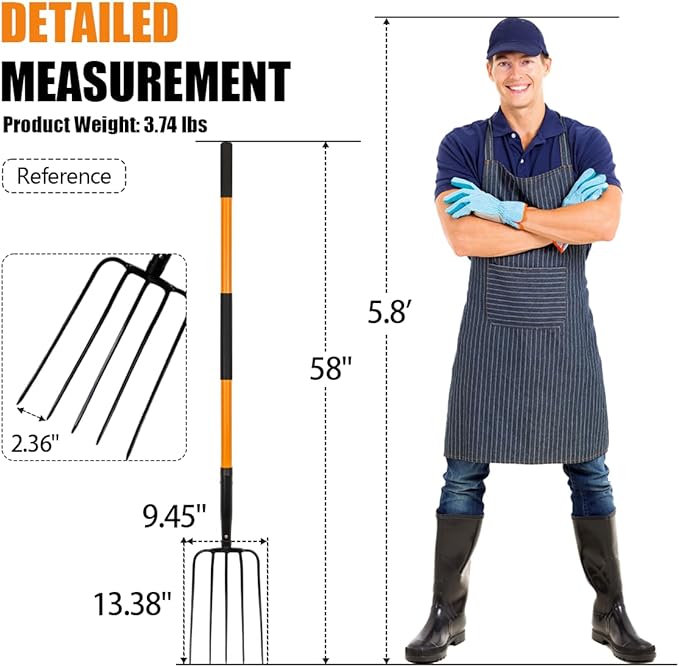 - Dimension: Heavy duty pitch fork with an overall length of 58 inches are suitable for adults, the right size can reduce the pressure on your back when using for a long time without fatigue to improve efficiency.