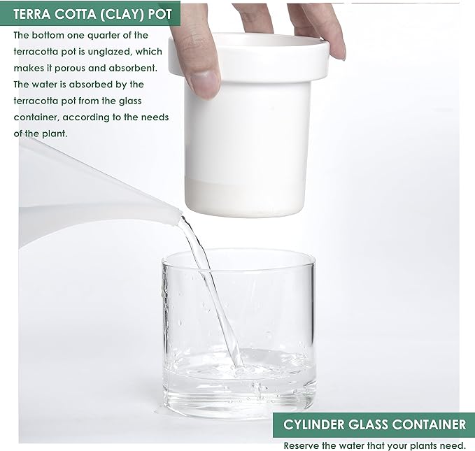 - [Self-watering System] The bottom quarter of the terracotta pot is unglazed, just fill the glass container with water to ensure plants will absorb only what they need through the terracotta pot walls.