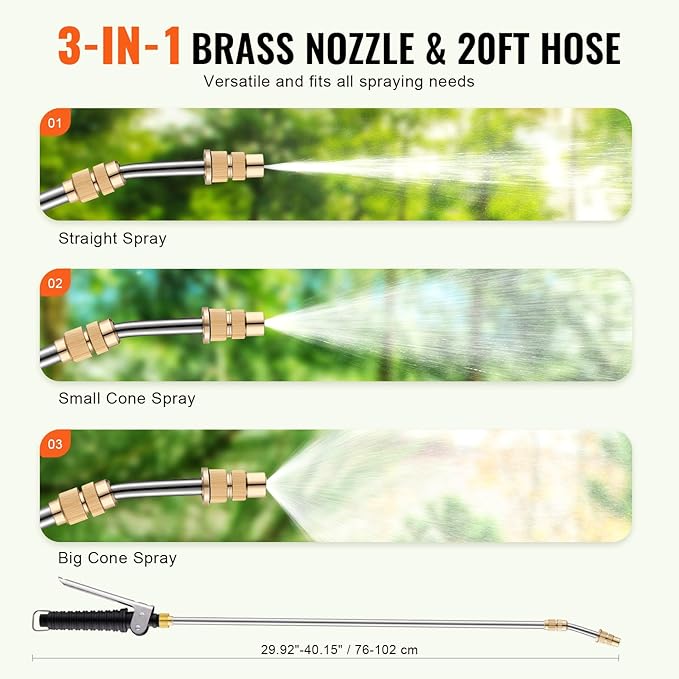 - Handheld Spray Boom & Brass Nozzle: Our telescopic boom offers adjustable spraying distances, while sturdy brass nozzle ensures durability. The reinforced handle offers a comfortable grip, and the 5.6" large tank opening facilitates easy liquid pouring.