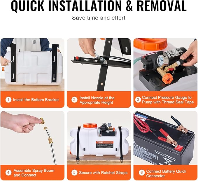 - Strong Spray, Broad Range: The 12V pump delivers high pressure at 116PSI and a flow rate of 1.9GPM, ensuring potent spraying with wide coverage. Adjust the working pressure from 0 to 72PSI with the built-in gauge for precise control. The 8 ft quick coupling line simplifies setup.