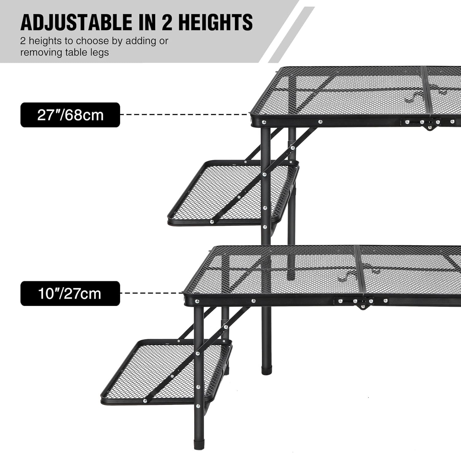 - [Premium Material&Design]This aluminum grill table is made of powder coating iron mesh (table top) and thicker aluminum alloy frame (Diameter 25mm). It also has X-shape side support and secure latch to ensure stable use.