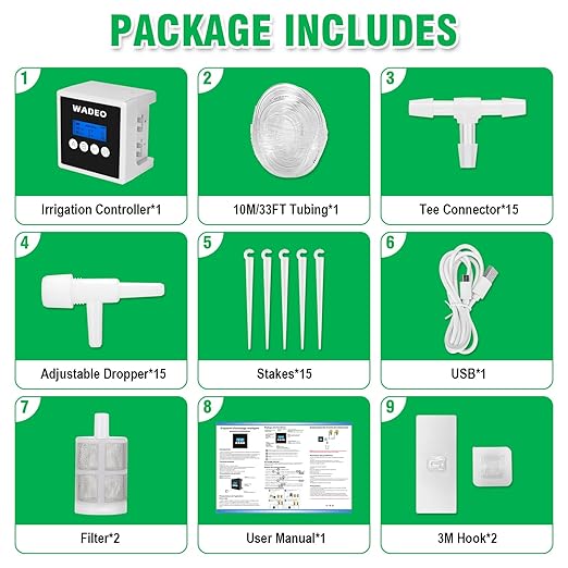 - What This Automatic Watering System for Potted Plants Includes: Irrigation Controller*1, 10M/33FT Tubing*1, Tee Connector*15, Adjustable Dropper*15, Stakes*15, USB*1, Filter*2, User Manual*1, 3M Hook*2.