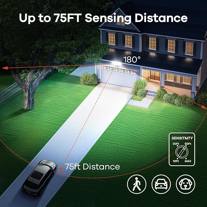 - 【180°/75FT Motion Sensor】The flood lights outdoor motion sensor is upgraded with 180° wider detecting angle and adjustable 10ft/30ft/50ft/75ft detecting distance. The sensor can be adjusted horizontally 330° and vertically 120°. This flexible sensor can accurately detect animals, people, and cars.