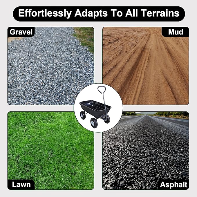 - 10inch Pneumatic Tires: The garden wheelbarrow is equipped with 10" Noise Reduction Pneumatic Tires to ensure durability and usability, with a larger force area for better grip and friction, smooth steering, and a large ground clearance to ensure that the garden wheelbarrow is able to adapt to a wide range of road conditions such as grass, snow, beach, and mud.