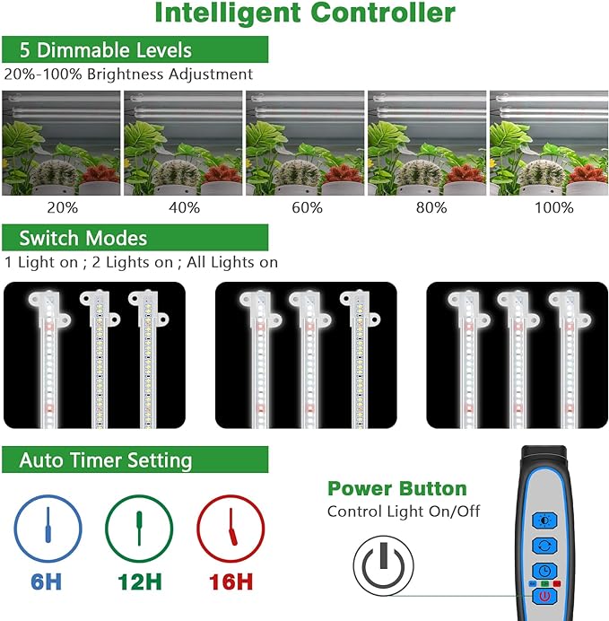 - 3 switching functions and 5 brightness: Press button for 5 Dimmable , no need to worry about burning plants. It also have 3 switching functions of the light bar, โA light on, B light on, All light onโ. Suitable for both home, office.