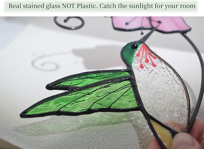 Lolitarcrafts Hummingbird with Flower Stained Glass Suncatcher Bird Stained Glass Window Hangings Hummingbird Gift for Home Decor (Green with Flower)