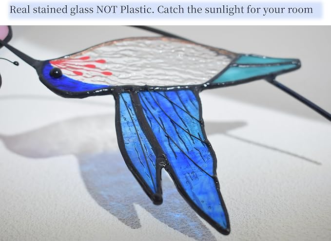 Lolitarcrafts Hummingbird with Flower Stained Glass Suncatcher Bird Stained Glass Window Hangings Hummingbird Gift for Home Decor (Blue with Flower)