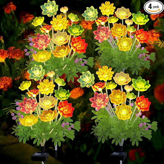 • Upgraded Succulent Plant Solar Lights-Compared with ordinary ground lights, each solar garden light has 12 succulent plant lights and green lifelike leaves. Their designs are more elaborate and realistic than other succulent decorations. We also upgraded the solar panels to a larger size and a higher conversion rate than other solar panels