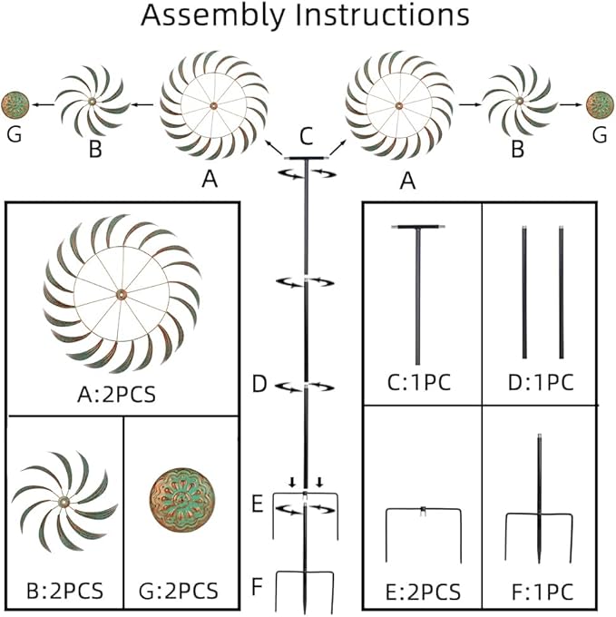 - Easy to Install: This large yard wind spinners have a simple and easy to install structure, without the need for any additional tools. Just follow the accompanying instructions for 3-5 minutes and you can quickly enjoy a happy courtyard life