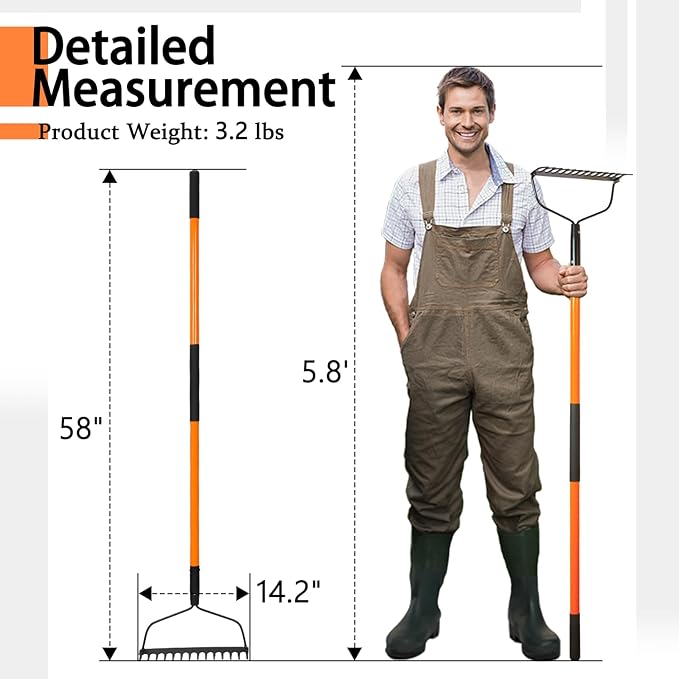 - Practical & Convenient: The heavy duty rake has a 58 inches long handle for comfortable handling and a wide reach, the long handle design allows you to easily extend your arms to clean and turn the ground without having to bend over, thus reducing your physical burden. Whether you're tackling a large garden area or tilling the ground, this lawn rake reduces fatigue by allowing you to complete tasks in a more natural position.