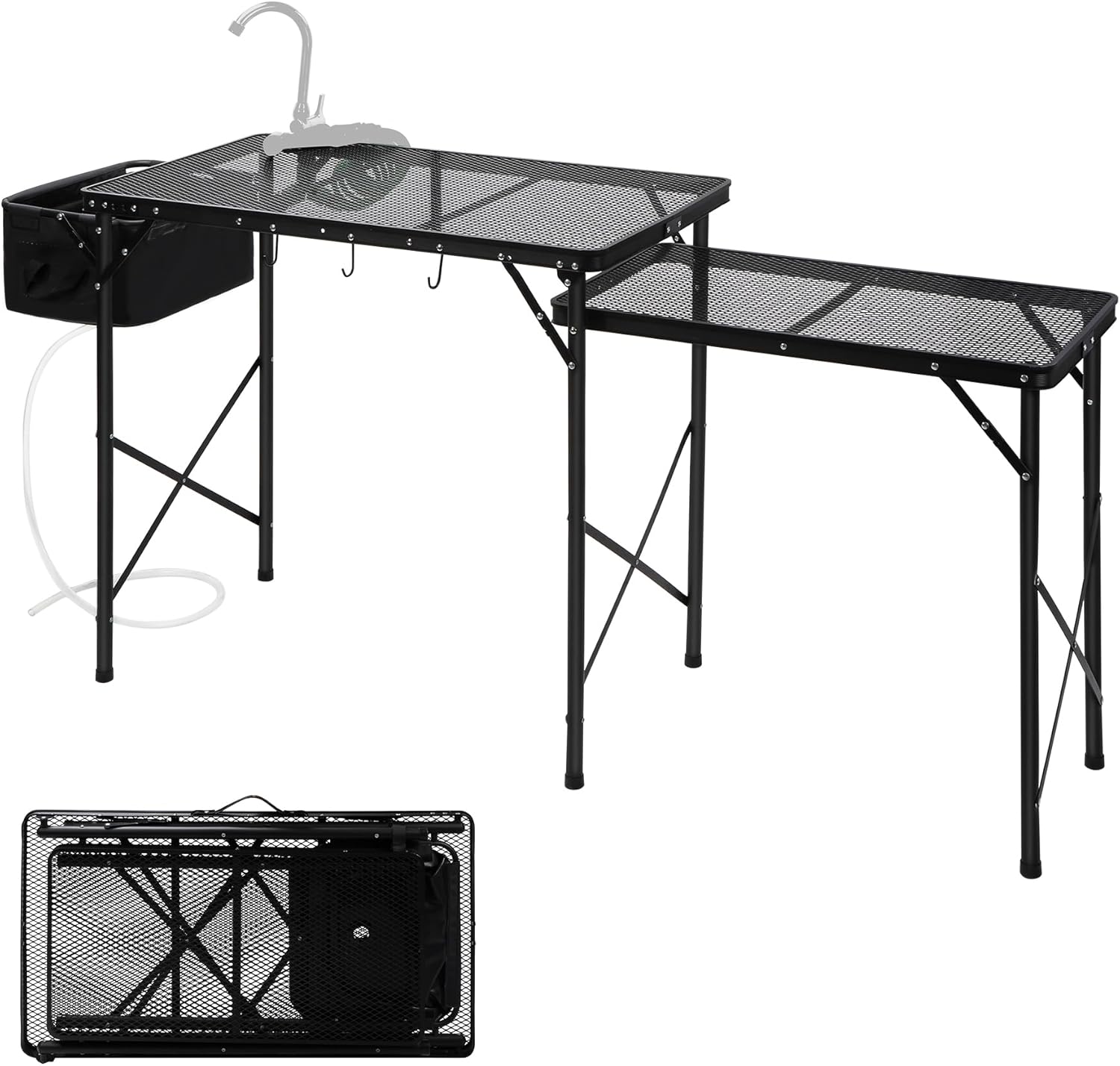 - - Stable Construction: The frame of the foldable table is constructed from premium aluminum, ensuring long-lasting durability. The metal mesh top is both robust and easy to clean, making it perfect for outdoor use. Extra faucet attachment specially provided to hold your faucet equipments. (Faucet and Water Gun Are Not Included)