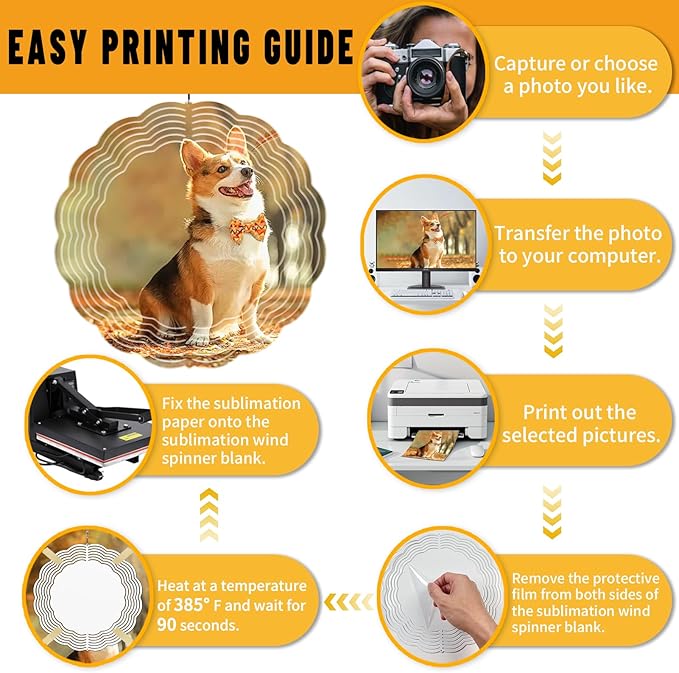 - [EASY TO USE] The sublimation wind spinner arrives blank and flat, ready for your personal touch. Choose a picture and sublimate at 385ยฐF (196ยฐC) for about 90 seconds with medium pressure to achieve your desired design. Be sure to remove the plastic protector before sublimating. After DIY printing, easily bend the wind spinner into a vibrant 3D shape. Adjust the temperature and time as needed