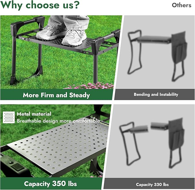 - 【Holds Up To 350 lbs! 】Gardening work seat is made of steel, which is stronger than the older generation. The reinforced design with four additional protective corners is more ergonomic and suitable for long-term gardening work.