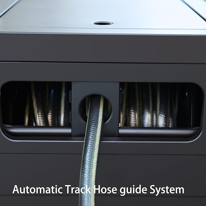 - [Automatic Track Hose guide System]: The hose guide at the front of Water hose reel guides hose evenly as you rewind, kick away all of kink trouble. Keeps your hands clean and free.