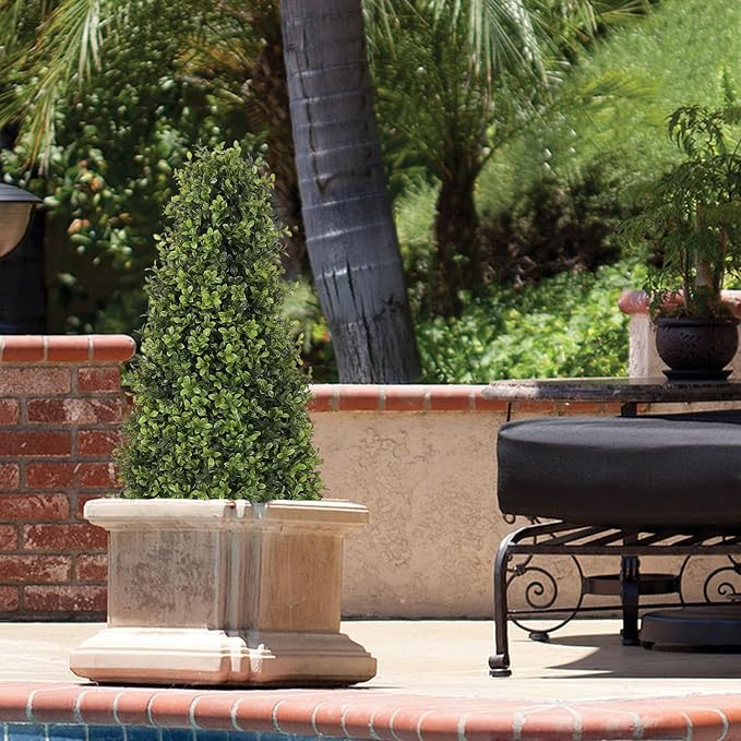 3ft Artificial Boxwood Topiary Trees (Set of 2) - UV Resistant Faux Plants Outdoor, Realistic 36" Fake Cone Bushes and Shrubs for Front Porch, Planter, Patio - Low Maintenance & Evergreen