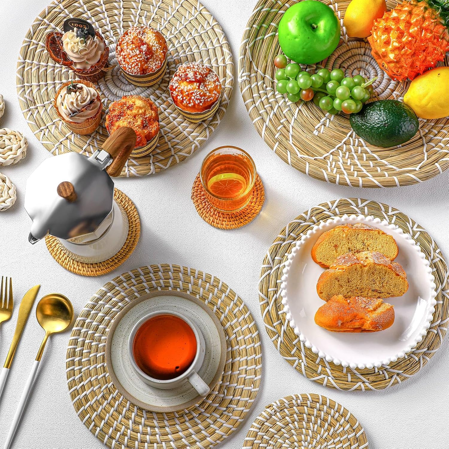 11 Pcs Boho Hanging Wall Basket Decor Handmade Woven Basket Wall Decorative Boho Wicker Baskets Placemats Round Farmhouse Bulrush Art for Rustic Home Decorations Christmas Gift(Fresh)