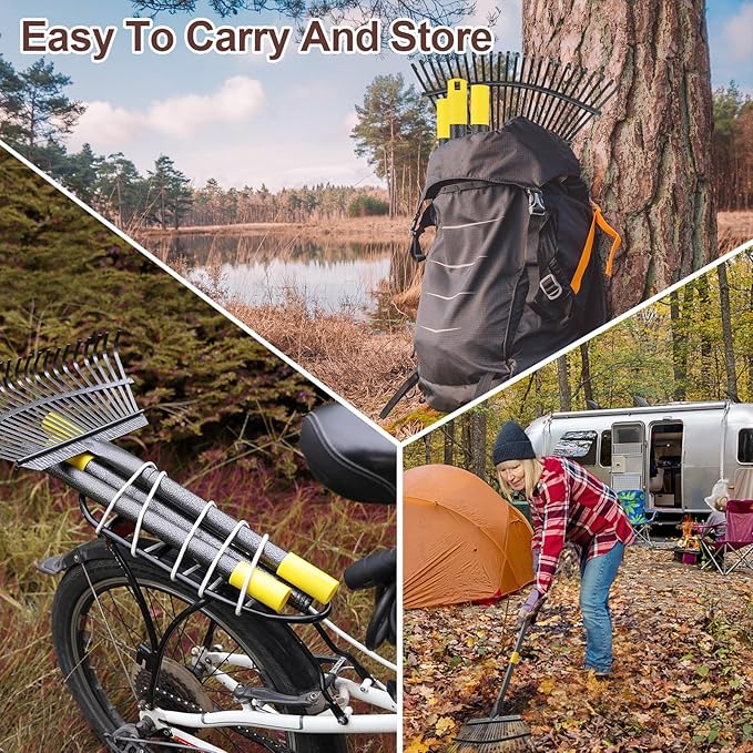 - Easy to Carry and Store: Our lawn rake takes up less space in your garage than traditional bulky wooden handled rakes. The easy-to-assemble design is perfect for on-the-go transportation and outdoor camping activities, and the rake can be used anywhere for cleanup.