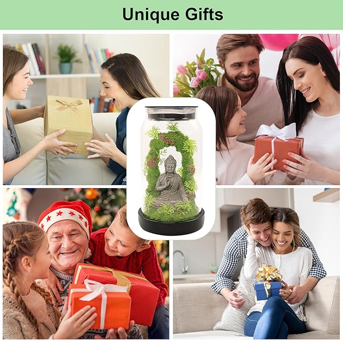 - Suitable Size: This Zen Buddha statue decoration measures 9.84"H x 5.7"W x 5.7"D. The jar is made of glass and the Buddha is made of resin. Sitting cross-legged in a jar, this garden statue is decorated with simulated green moss arched doors at the back, creating an atmosphere of serenity and peace in any time and space.