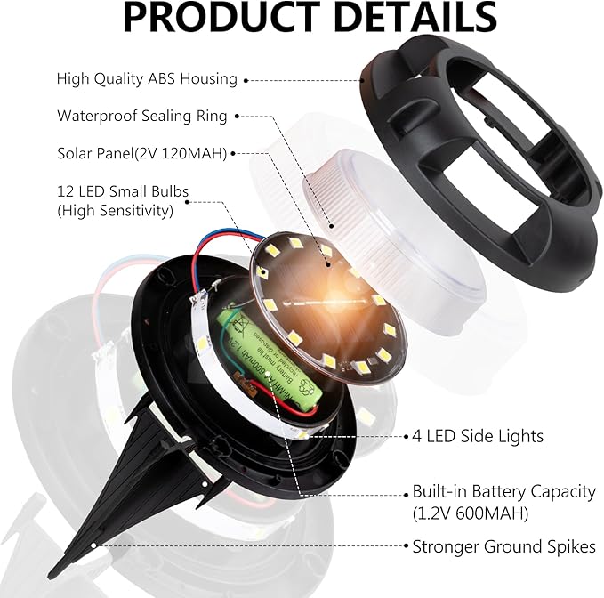 - Energy Efficient, Automatic on/off:Our solar panel size is up to 120 mAh, greatly improve the efficiency of light energy conversion, built-in 600 mAh battery,can illuminate for 10-14 hours with 6-8 hours of charging. Besides, these solar groud lights automatically turn on at dusk and turn off at dawn or in bright places. Save electricity costs and provide you with a bright outdoor decorative landscape