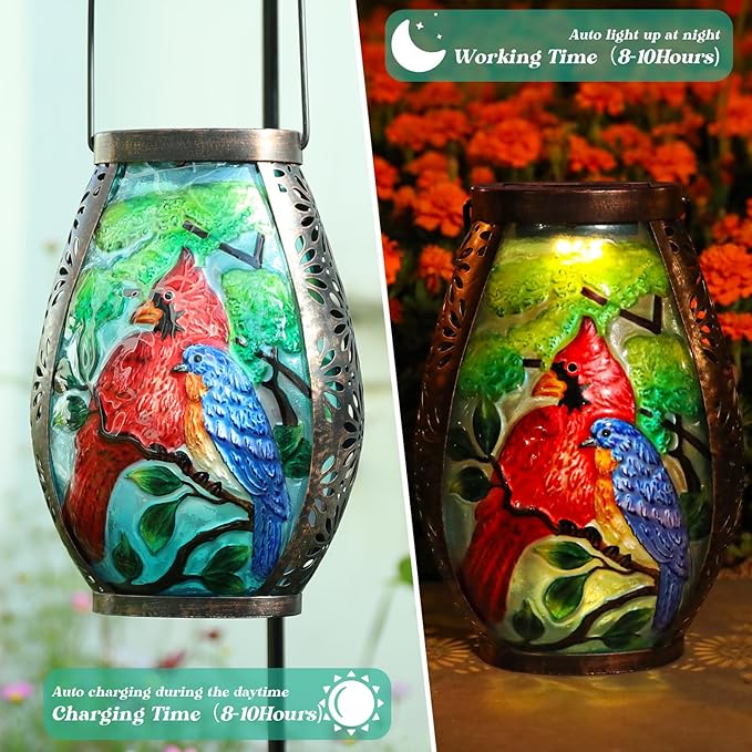 - 【Cardinal Garden Decor】Hanging solar lantern feature a exquisite cardinal bluebirds pattern and IP44 waterproof functions make it suitable for outdoor decoration and use, glowing birds lantern will be nice additions to your garden