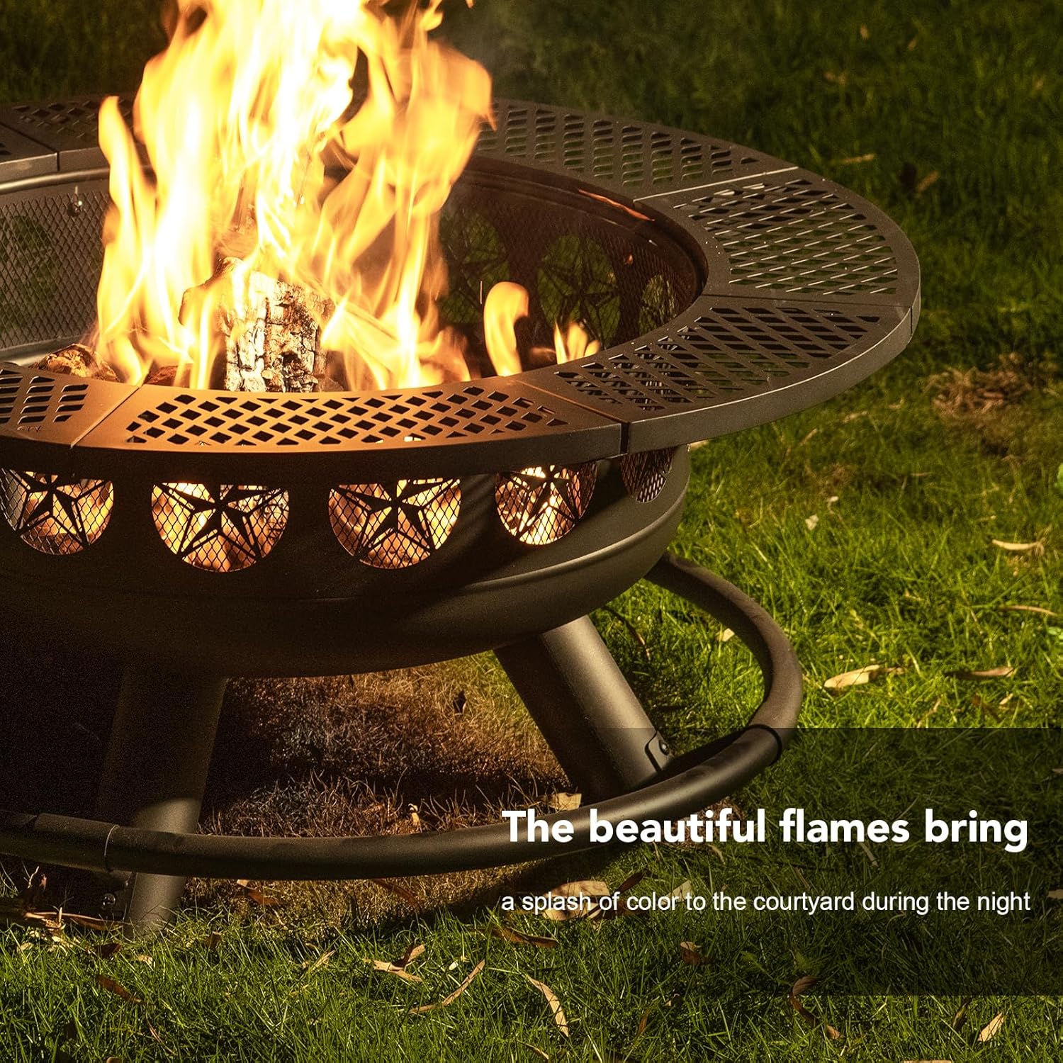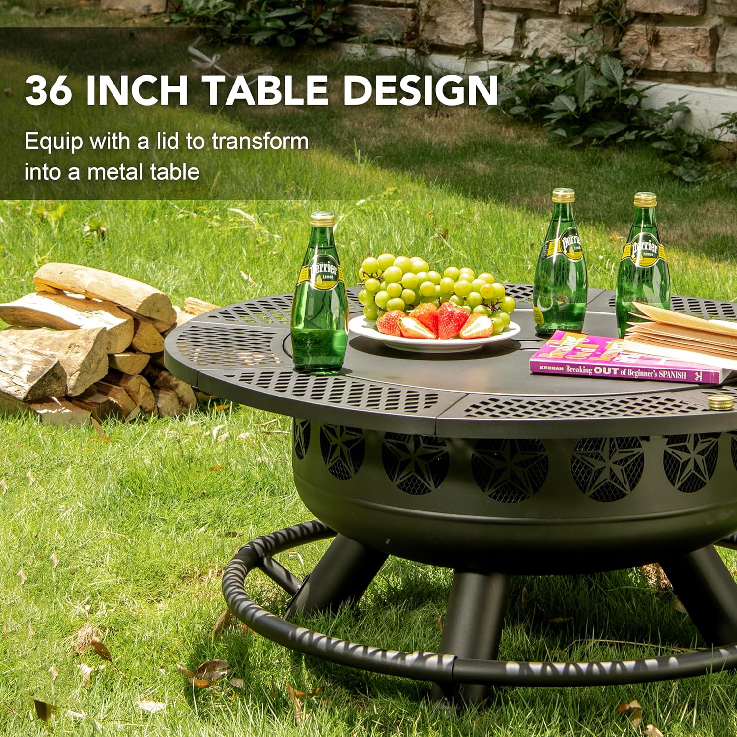 - Specification Of Fire Pit: This wooding burning fire pit measures 36” Dia x 26” H,and the cooking grate with an 18.5-inch diameter grill area, is safe to cook on it.The fire bowl is 24 inch,can hold about 10 pounds to burn. Equipped with a 24 inch lid, it transforms into a 36 inch metal table.