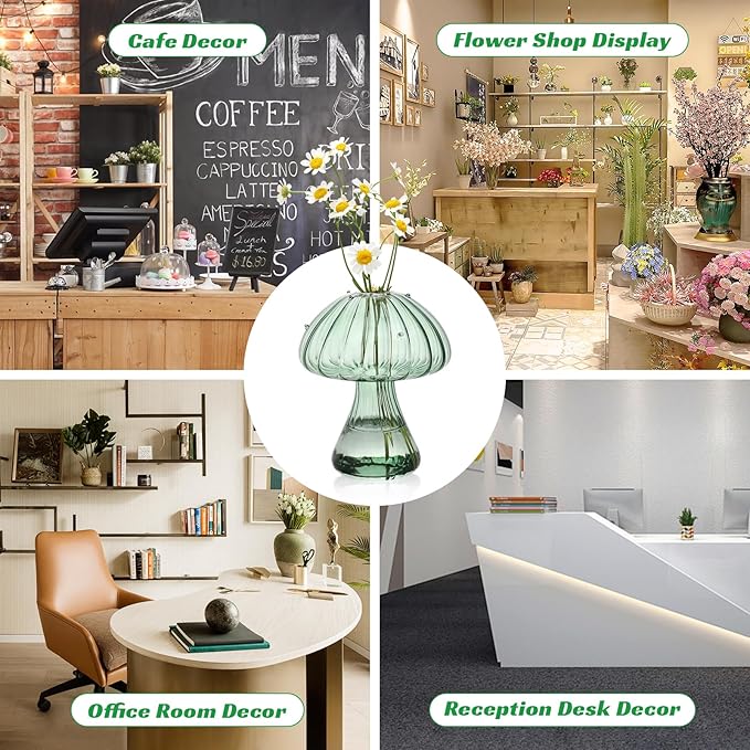 - Cute Mushroom Decor Planter: This is a set of 6 hydroponic glass vases with redesigned shapes and coordinated colors to create an oceanic, free-spirited feeling for your indoor environment. You can create more personalized uses, such as flower arrangements, creating micro-landscapes, or replacing aromatherapy stick containers and so on.