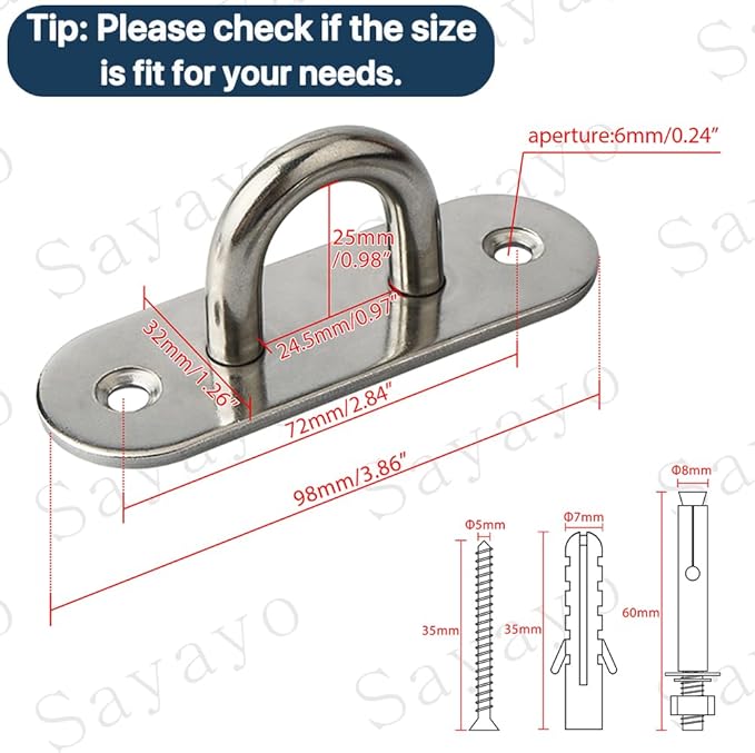 - Easy to install & Tip: The screw hooks package includes all the accessories and installation instructions you need. 6 x oval eye pad + 12 x expansion bolts (0.31โโDia, 2.36โโL) + 12 screws + 12 plastic anchors. Tip: Make sure the pad eye plate hooks are the right size for your needs.