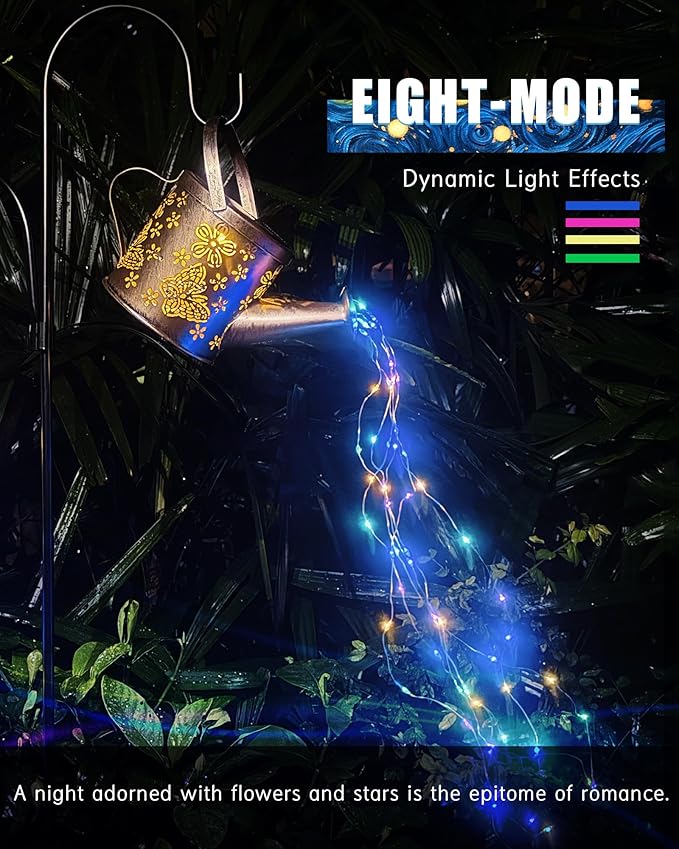 - Upgraded Colorful Solar Watering Can: Elevate your outdoor ambiance with our multicolored Cat-shaped hanging solar lantern featuring 8 light modes and 4 color LED strings, casting a starry glow as if pouring out a constellation. The warm yellow light filters through the exquisite cut-out design, creating a cozy and artistic atmosphere for memorable nights with family and friends