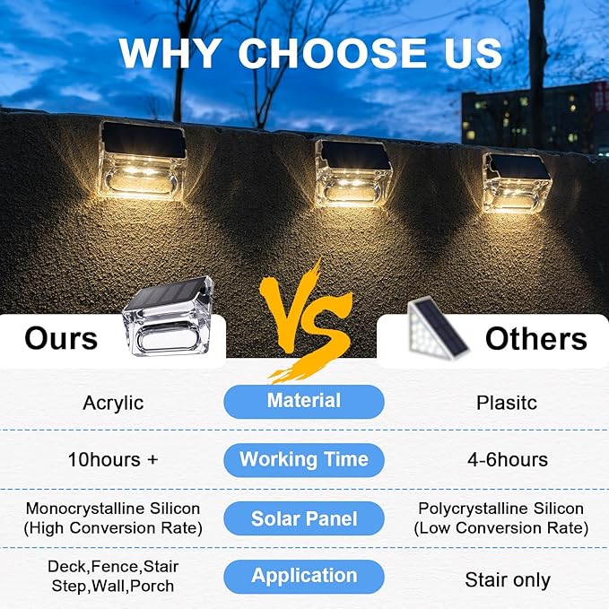 - 🔅【IP65 Waterproof & Long Working Time】The Solar Fence Lights are made of high-quality acrylic and high-strength ABS material, with an IP65 waterproof rating, ensuring the long-term durability of the step lights. In addition, the solar outdoor lights installed on the fence can withstand various extreme weather conditions, bringing you a more comfortable outdoor experience.