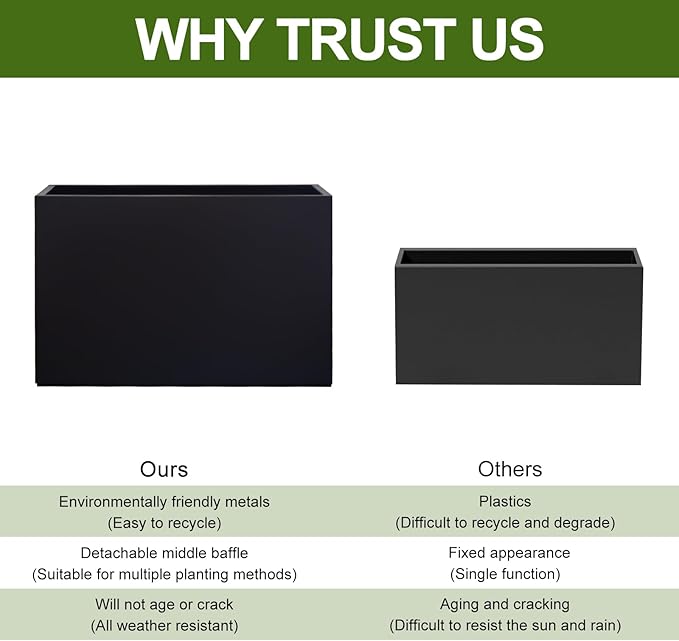 - ROBUST METAL CONSTRUCTION - Crafted from sturdy galvanized steel, this spacious planter boasts exceptional durability, ensuring it withstands outdoor elements without rusting or fading. Its weather-resistant design makes it suitable for year-round use in temperatures ranging from freezing cold to scorching heat, ideal for enhancing both indoor and outdoor settings.