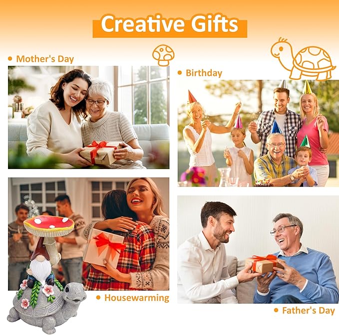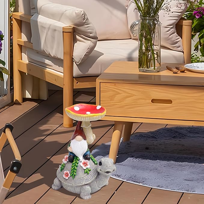 - 【Charming Garden Decor】The adorable garden turtle statue is the perfect addition to any garden. A dwarf with a mushroom and a cute turtle will attract wild birds and provide them with food, while also bringing life to your patio garden. This tortoise decor doubles as a high-quality garden lamp, perfect gift for moms and women