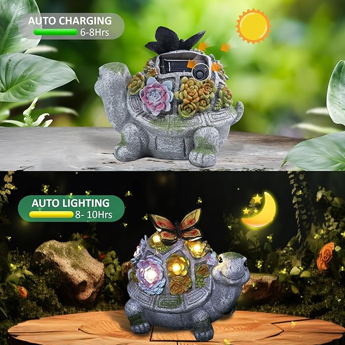 - 【Charming Garden Decor】The adorable garden turtle statue is the perfect addition to any garden. With intricate details and an attractive butterfly resting on the turtle's back, especially in the garden and courtyard, you can better feel its vitality. This tortoise decor doubles as a high-quality garden lamp, perfect gift for moms and women
