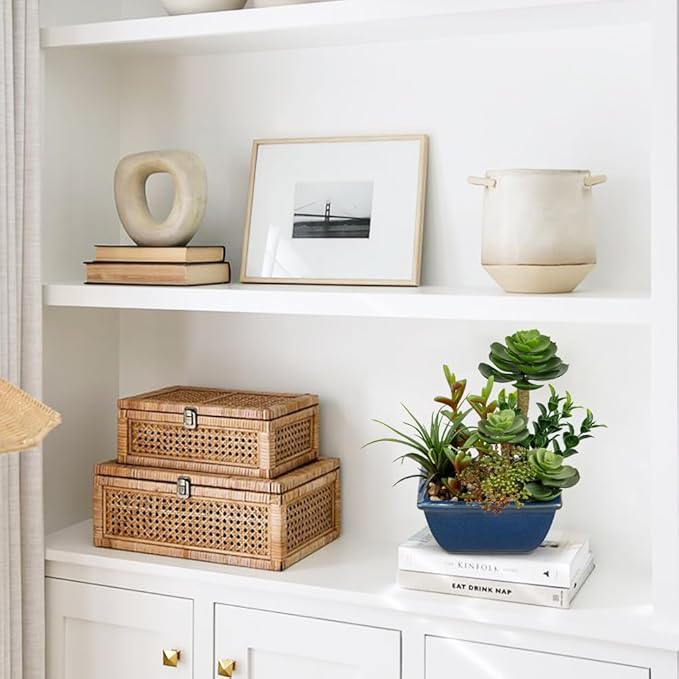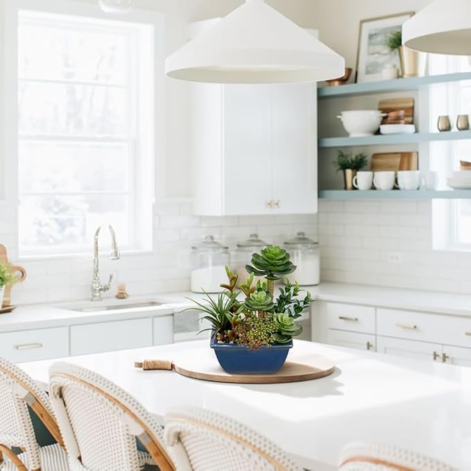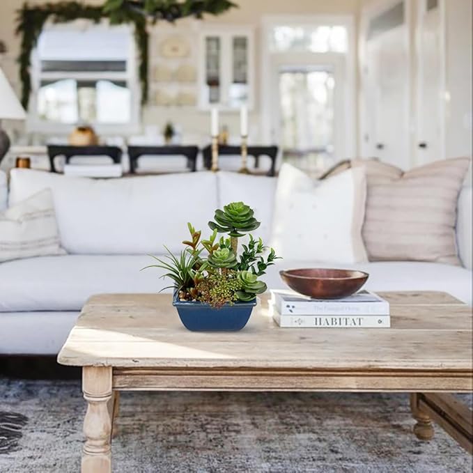 - Artificial succulents in pots subtly enlighten indoor decor with their bright color, potted plants artificial decor are unique in their own way which makes them look like a real succulent decor exhibition. Artificial potted plants decor: Small fake succulents are perfect for home, office desk, bedroom, bathroom shelf, kitchen, apartment, cafe, etc, faux plants in pots will add a natural accent to your home decor.