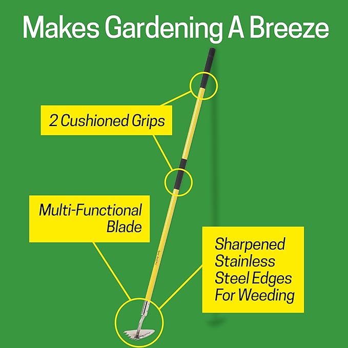 - GARDEN COMFORTABLY- Our 59โ long garden hoe handle lets you stand upright, eliminating back strain from bending over, making gardening a breeze. Developed with 2 cushioned grips to ensure a secure and comfortable hold so you can work longer with ease