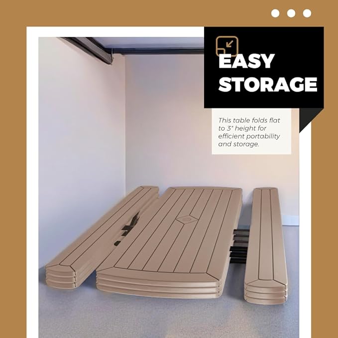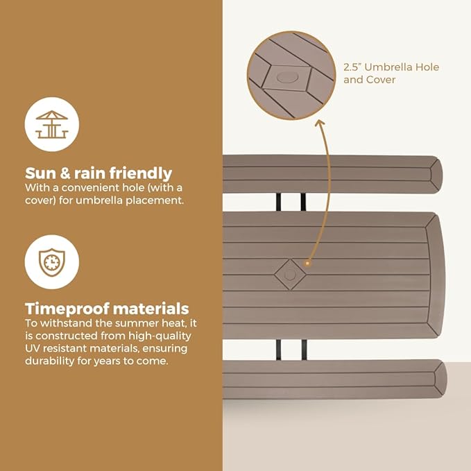 - Versatile Outdoor Companion: Designed for al fresco dining enthusiasts, our picnic table transforms outdoor spaces into vibrant hubs for shared experiences and cherished memories. Folds flat to 3" height for storage during winter and features a convenient hole (with a cover) for umbrella placement, ensuring shade on sunny days.