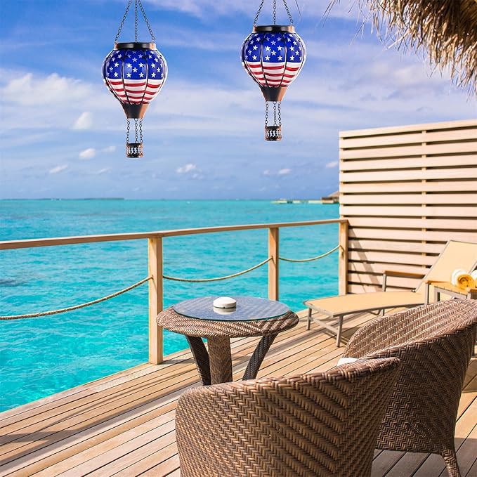 18inch Hot Air Balloon Solar Lantern with Flickering Flame Hanging Solar Outdoor Lantern Lights Waterproof Lanterns for Garden Patio Yard Party Decoration Star Flag