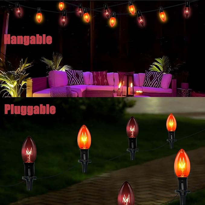 - End-to-End Connection:19.5 Ft Halloween decorations pathway lights with 10 C9 orange and dark purple light bulbs, E17 base, 7W, 6" lead cord with male plug, 24" distance between C9 incandescent lights, 12" lead cord with female connector, total 19.5 feet halloween lawn lights can connect up 6 strands, plug in halloween walkway lights can be used for outdoor parties, holiday decorations, or simply adding a touch of whimsy to your garden.