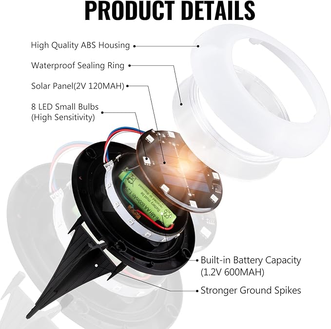 - ENERGY SAVING AND LONG LASTING - Our solar panel size is up to 120MA, greatly improve the efficiency of light energy conversion, could receive and store more solar energy, can illuminate for 10-14 hours with 6-8 hours of charging. Besides, these solar path lights automatically turn on at night and turn off at dawn or in bright places.