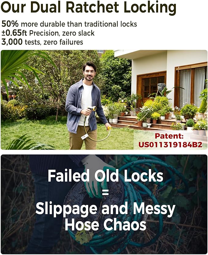 - Precision Dual Ratchet Locking (Patent: US011319184B2): GLAHODEN’s auto rewind water hose reel passes 3,000 rigorous tests with ±0.65 ft locking accuracy. 50% more durable than traditional locks, it eliminates hose slack and secures exact lengths, ensuring precise positioning at balcony corners or garden edges without dragging excess hose