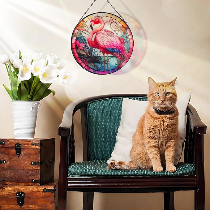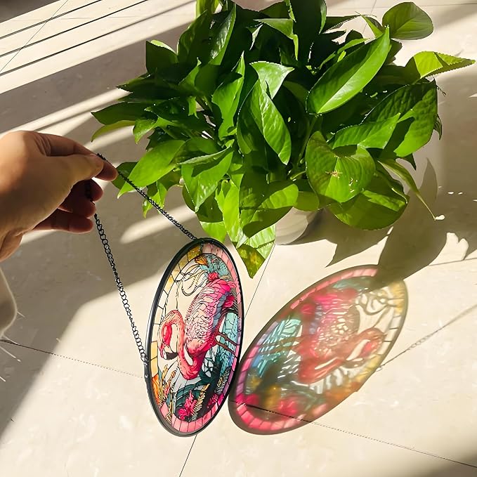 - 【Perfect Anywhere】This flamingos stained glass is sure to be a beautiful sight to hang in your garden, patio, balcony, window, hallway, entertainment venue and more. Flamingos sun catchers can also be used to decorate bedrooms, living rooms, gardens, terraces, and anywhere that needs to add a beautiful melody to the environment.