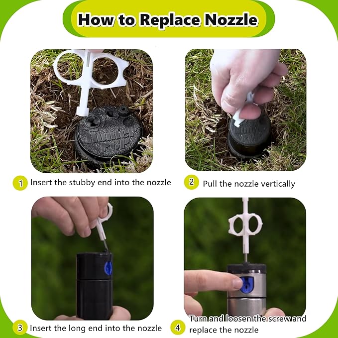 - Easy to Use - You can put plastic end inside the raised arrow, make a quarter turn and simply pull up to replace sprinkler nozzle; Insert the plastic end into corresponding slot to adjust the spray angle; Insert the metal end inside the raised arrow to fix the nozzle or adjust the spray distance